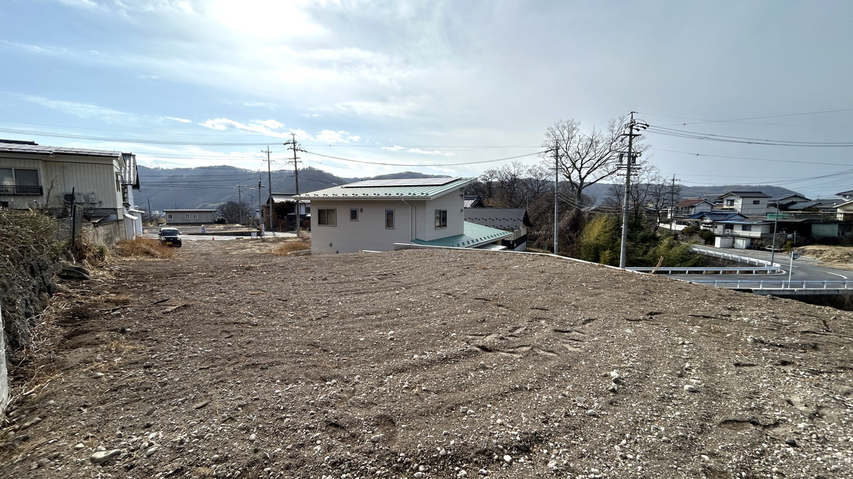 南西側より土地全景。道路と高低差があるため、遮られることなく見晴らしが良いです。